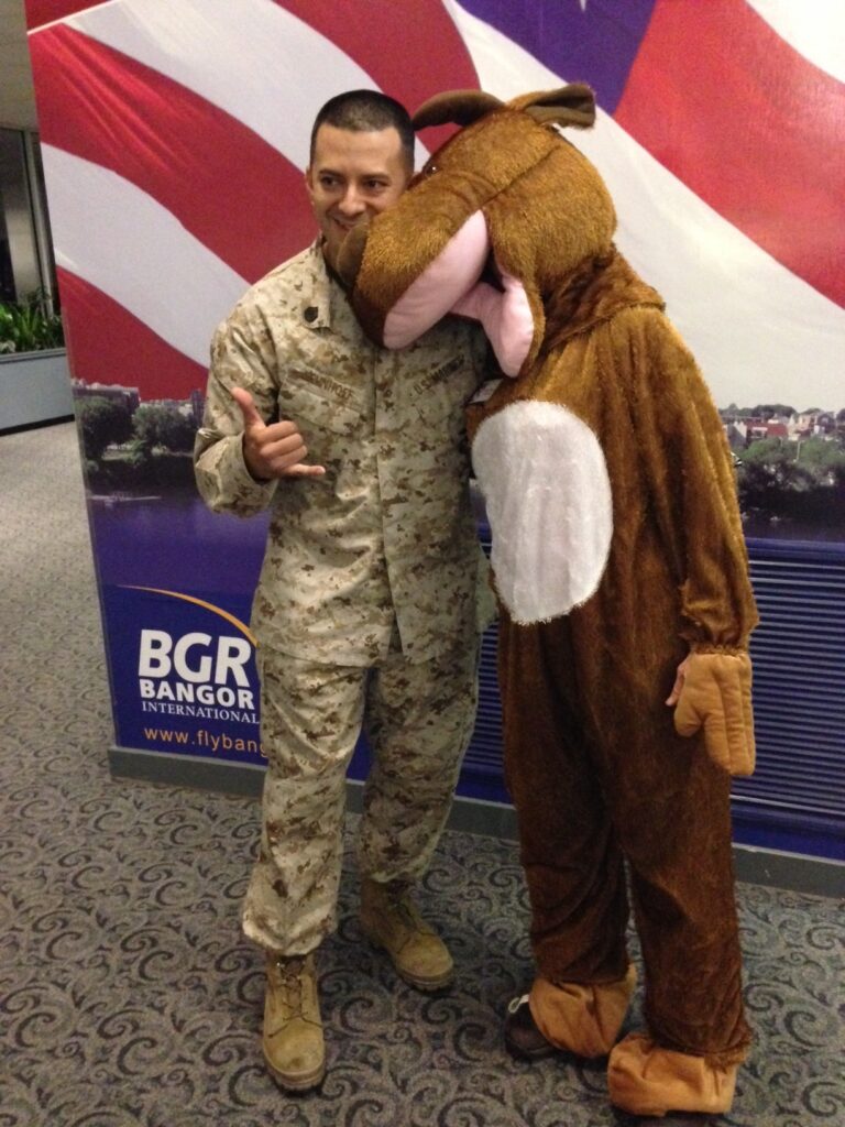 Nory liked to ask the Troops where they grew up and would usually ask, what is the best thing about where you grew up? This usually led to a moment of surprise and laughter when the troops had to think about their home and what made it special for them. For a while, she and Cindy K. would walk around the terminal, playing the “Happy” song. Nory dressed as a Maine moose for high fives with the troops, bringing some smiles, laughter and occasionally some troops even dancing with the moose!