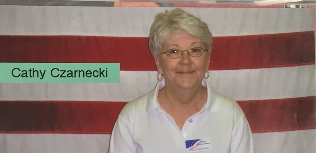 In 2003, Cathy’s cousin, Pat Jenkins, invited Cathy to join her to greet Troops at the Bangor International Airport. She went, and by the second visit, she was totally hooked, and it became an integral part of her life. Some of her childhood shyness persisted and it took her a while to become comfortable with the greeters, the routines and talking with the Troops.